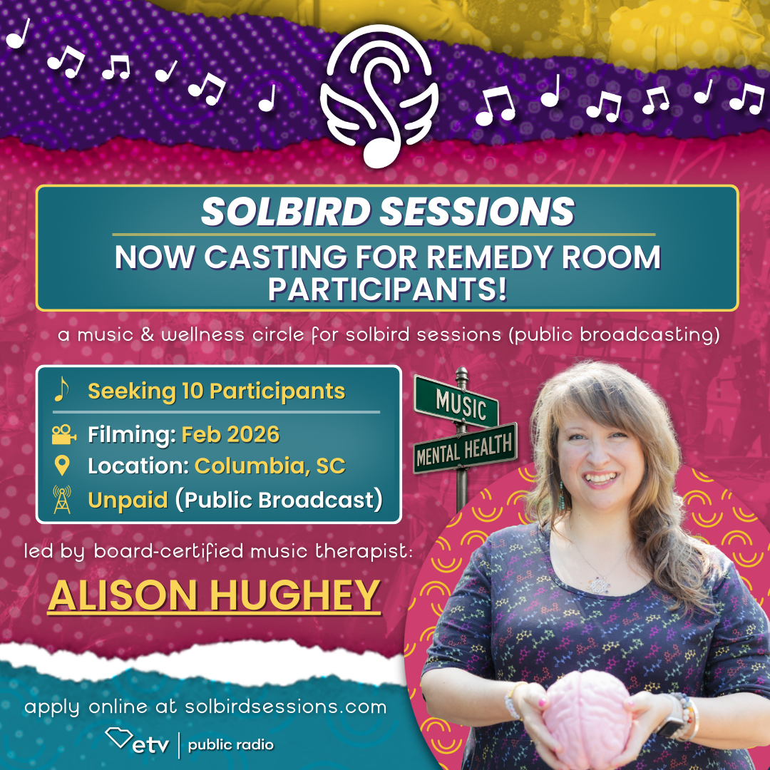 The Remedy Room is a featured segment of Solbird Sessions that offers a guided music and wellness circle led by our resident board-certified music therapist, Alison Hughey of Carolina Music Therapy.